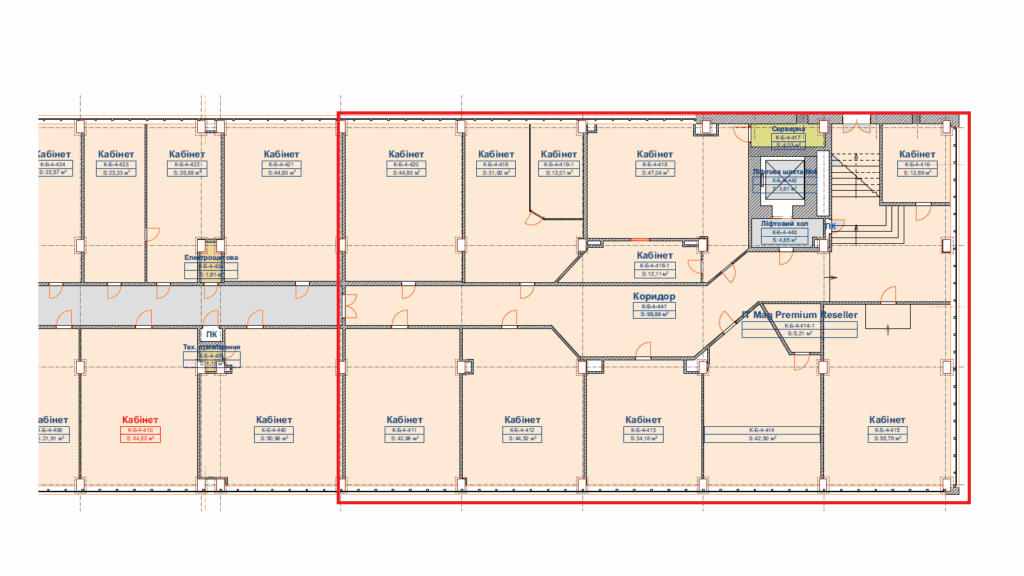 В долгосрочную аренду – офисные помещения в БЦ Кронос Гаррет Джонса 15. Возле г. Дорогожичи, Шевченковский район. На 4-м этаже офисы с кабинетной системой. Общая площадь: 587,75 м²